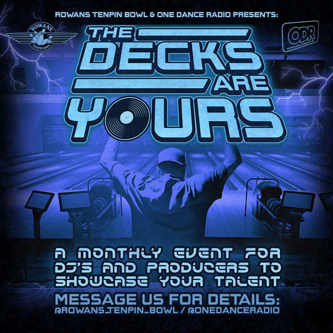 Rowans Tenpin Bowl & OneDance Radio Presents The Decks are Yours A monthly event for DJs & Producers to showcase your talent Message us for details @rowans_tenpin_bowl @onedanceradio